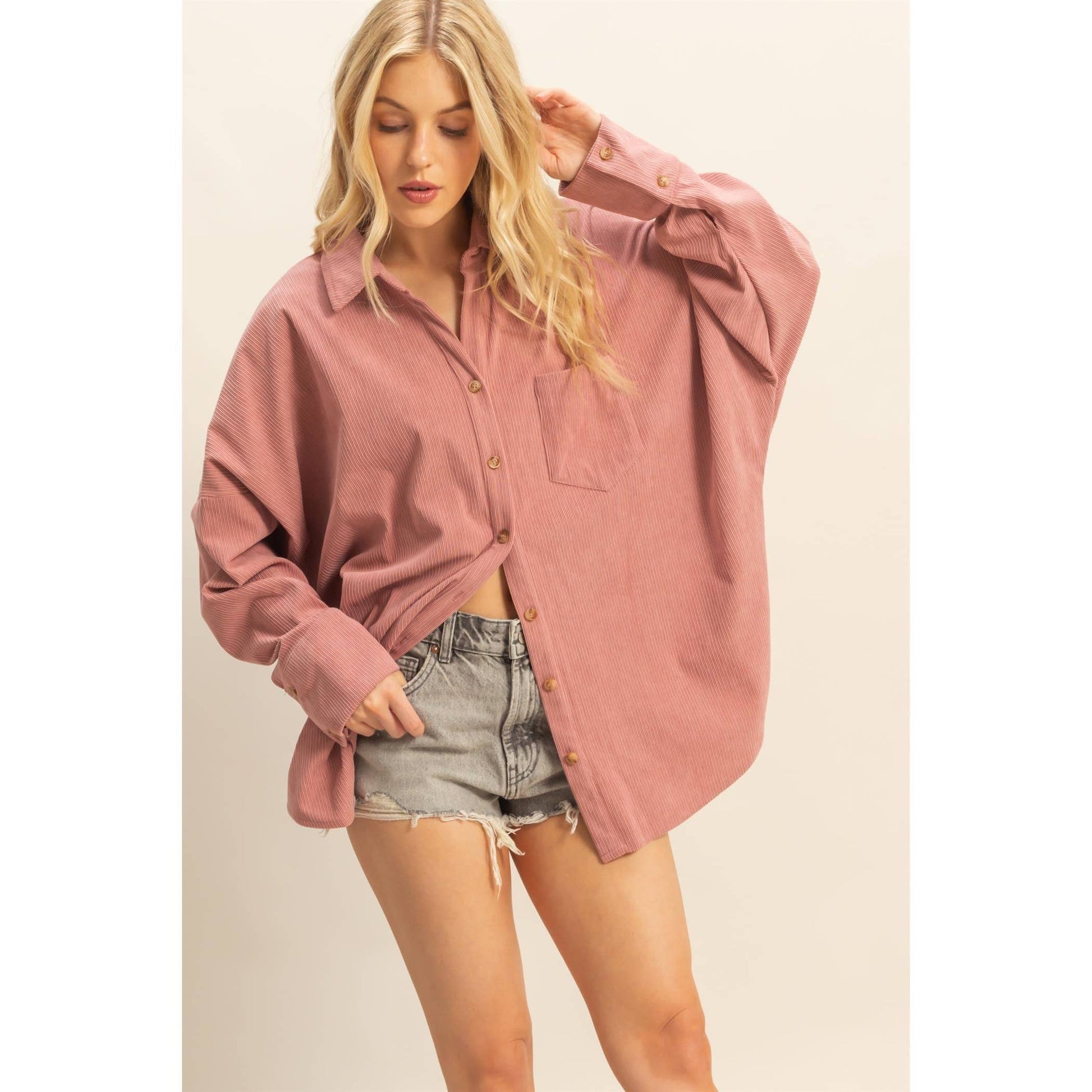 Embrace a blend of comfort and style with this relaxed fit corduroy shirt. Featuring a classic collar and front-button closure, this piece exudes a laid-back vibe. The textured fabric adds depth while the tailored silhouette ensures a flattering fit. Perfect for weekend outings or casual layering over a basic tee. Style it with skinny jeans or leather pants for an elevated everyday look.