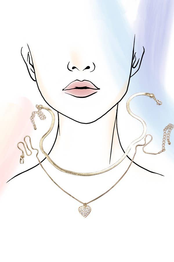 This modern layered necklace features a rhinestone heart with snake chain necklace. This will look great with your jumpsuit or puff hem dress. Longest box chain and shortest herringbone chain.