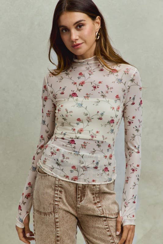 FLORAL MESH PRINT LONG SLEEVE KNIT TOP