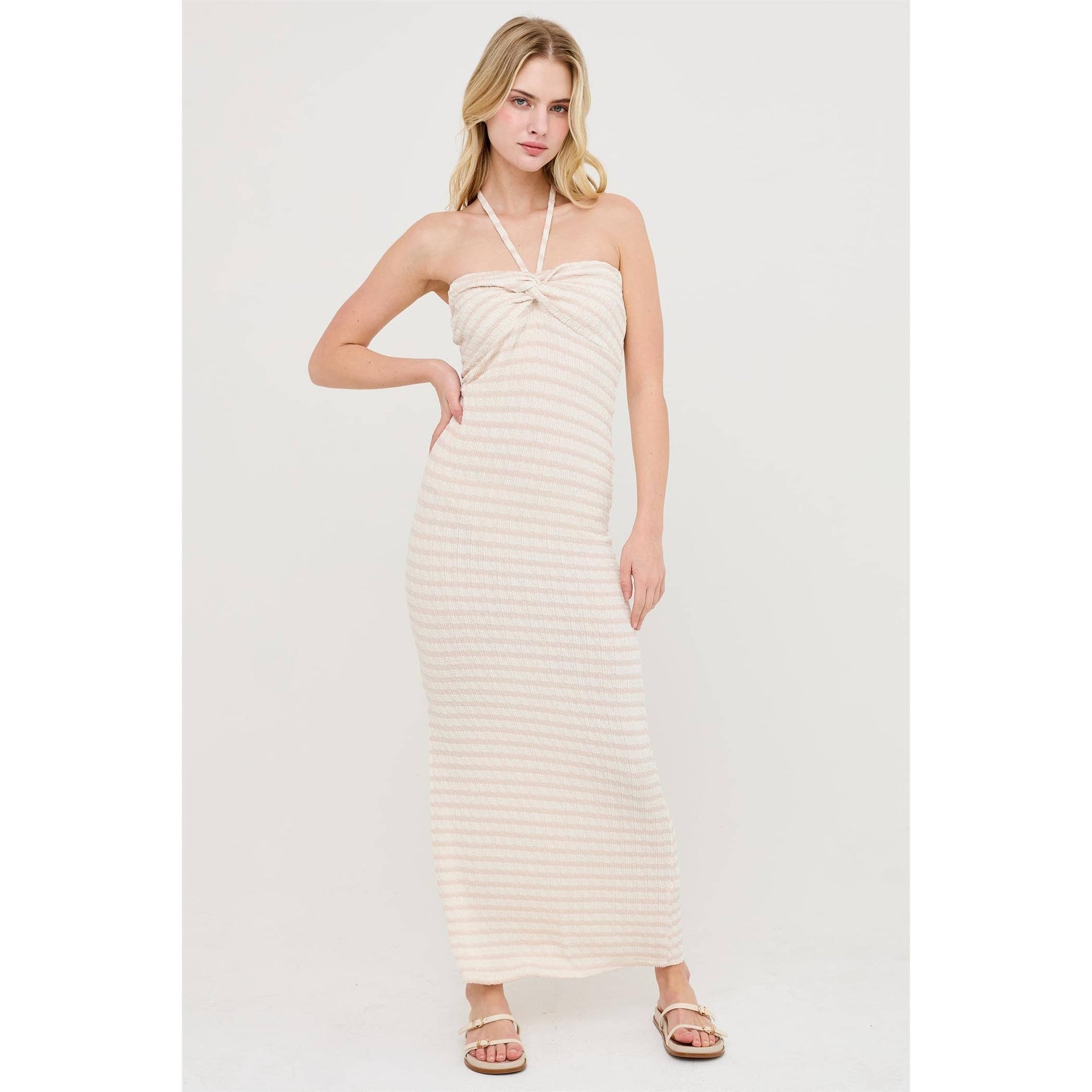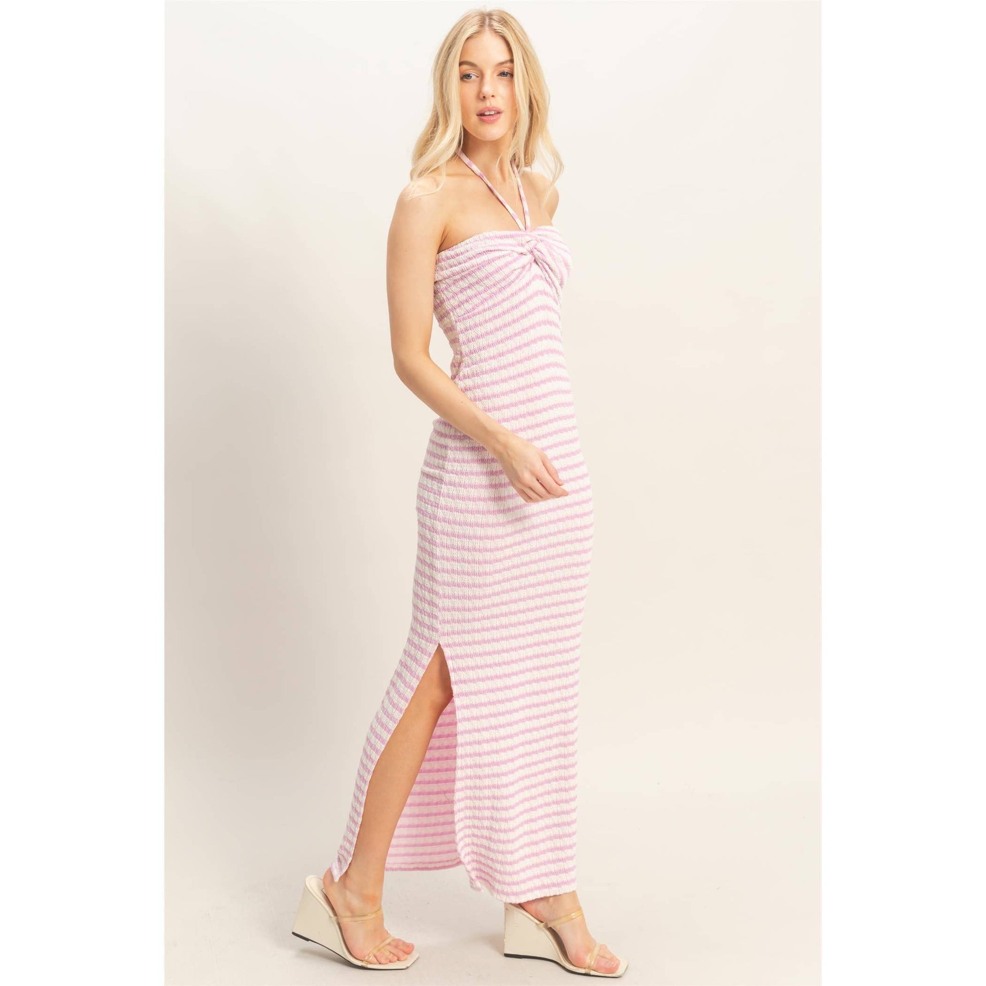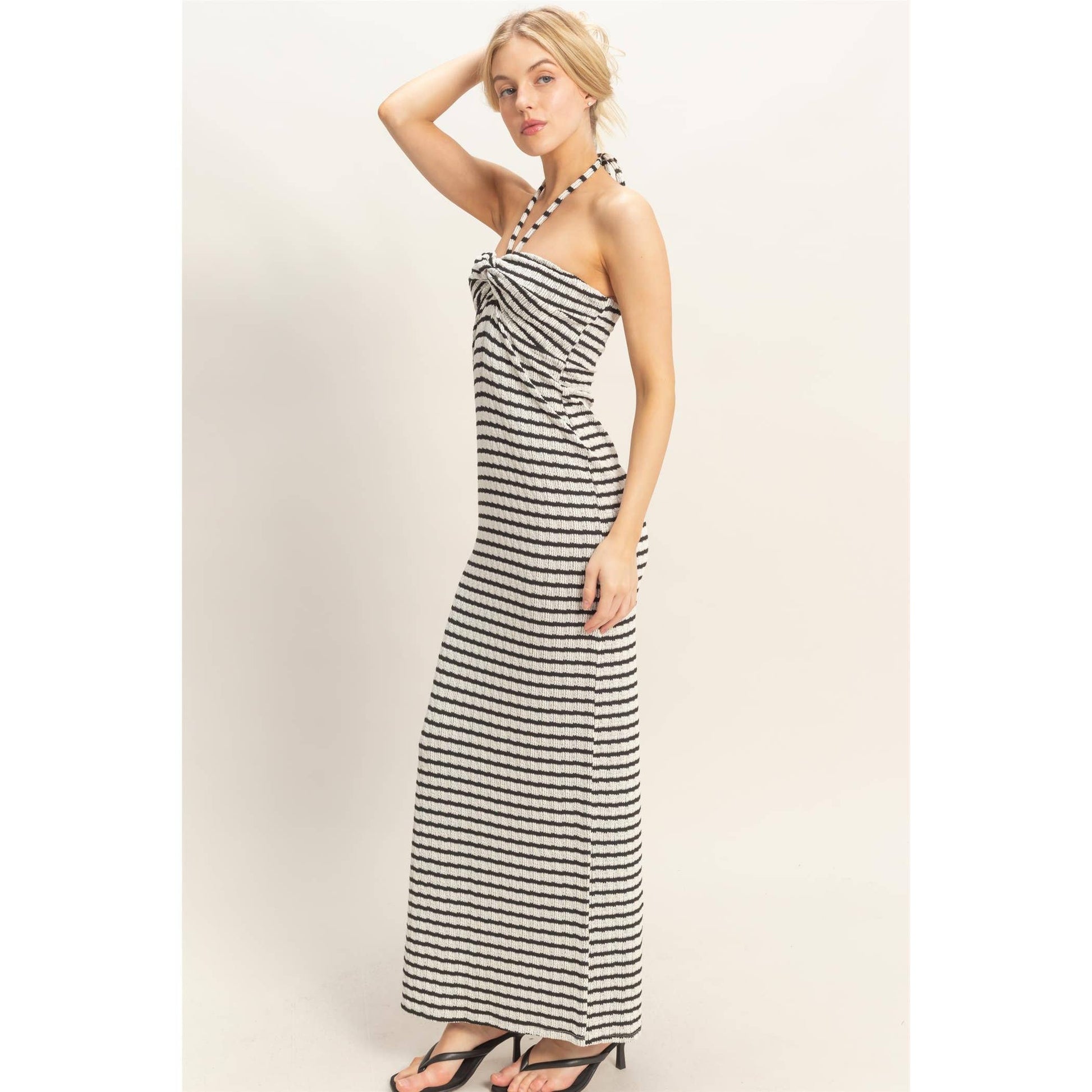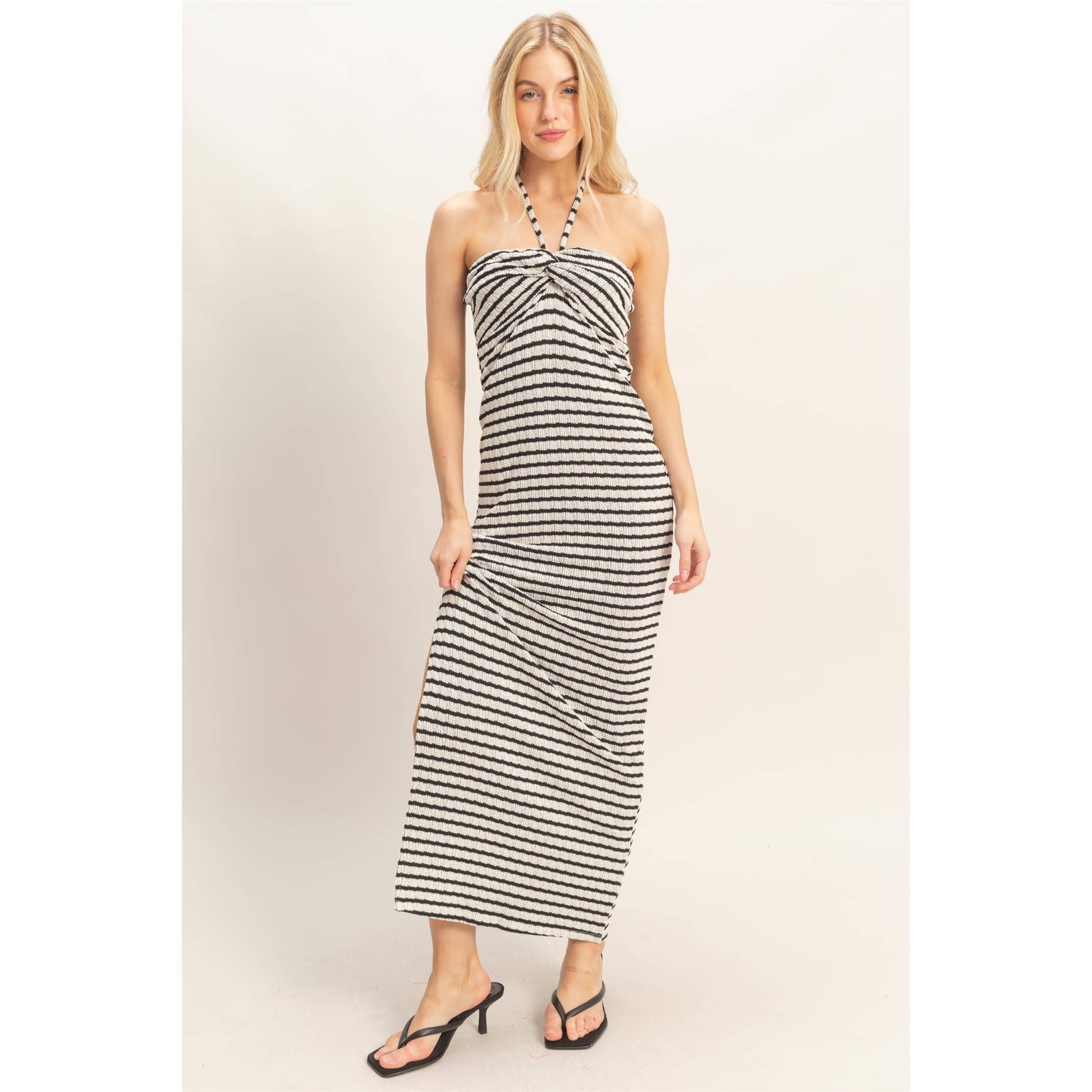This elegant maxi striped dress features a chic halter neckline with a unique twist bust detail, enhancing its modern appeal. The silhouette is designed with a flattering side slit, adding movement and a touch of allure. Pair with strappy sandals and a woven tote bag for a fresh summer look.
