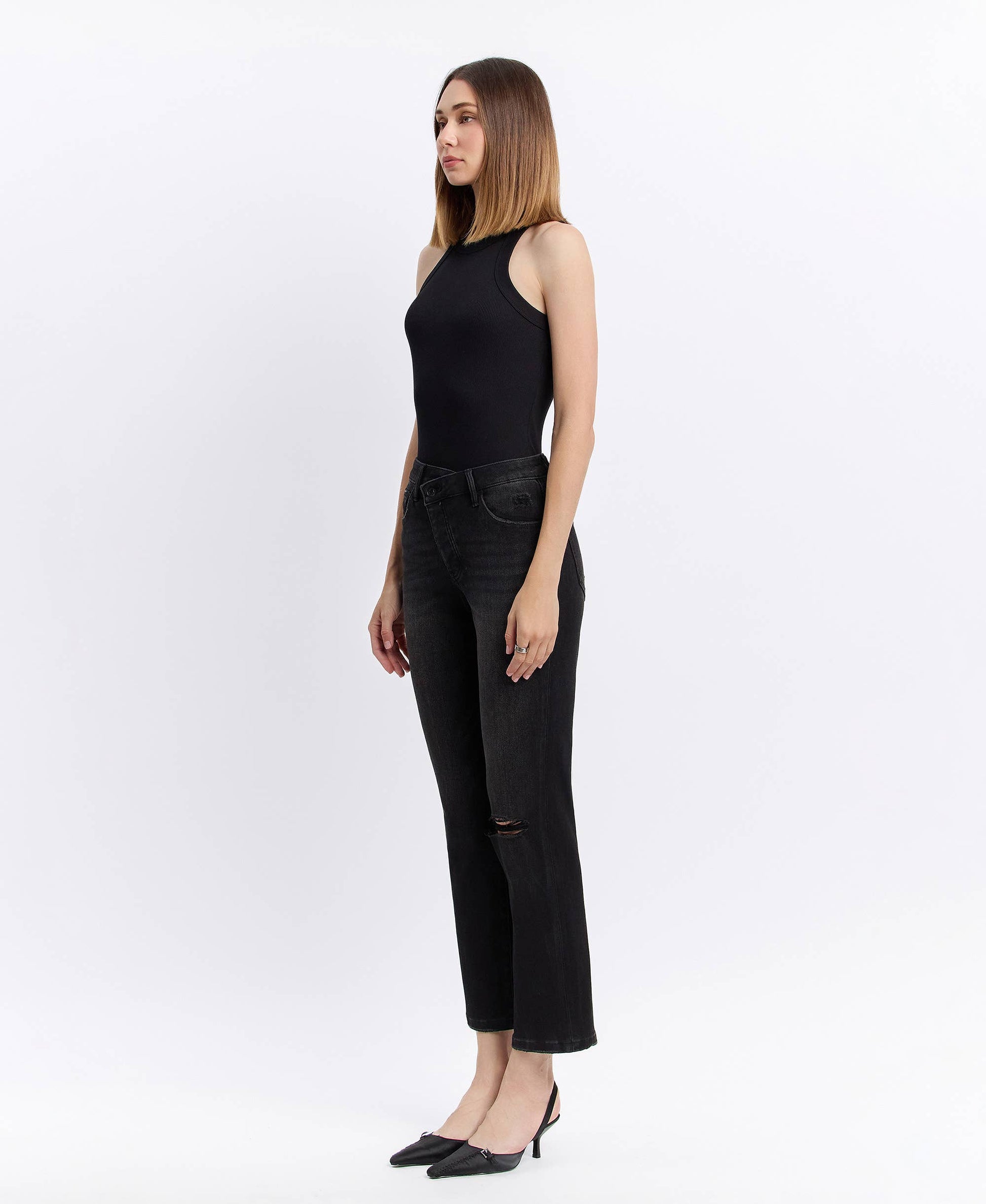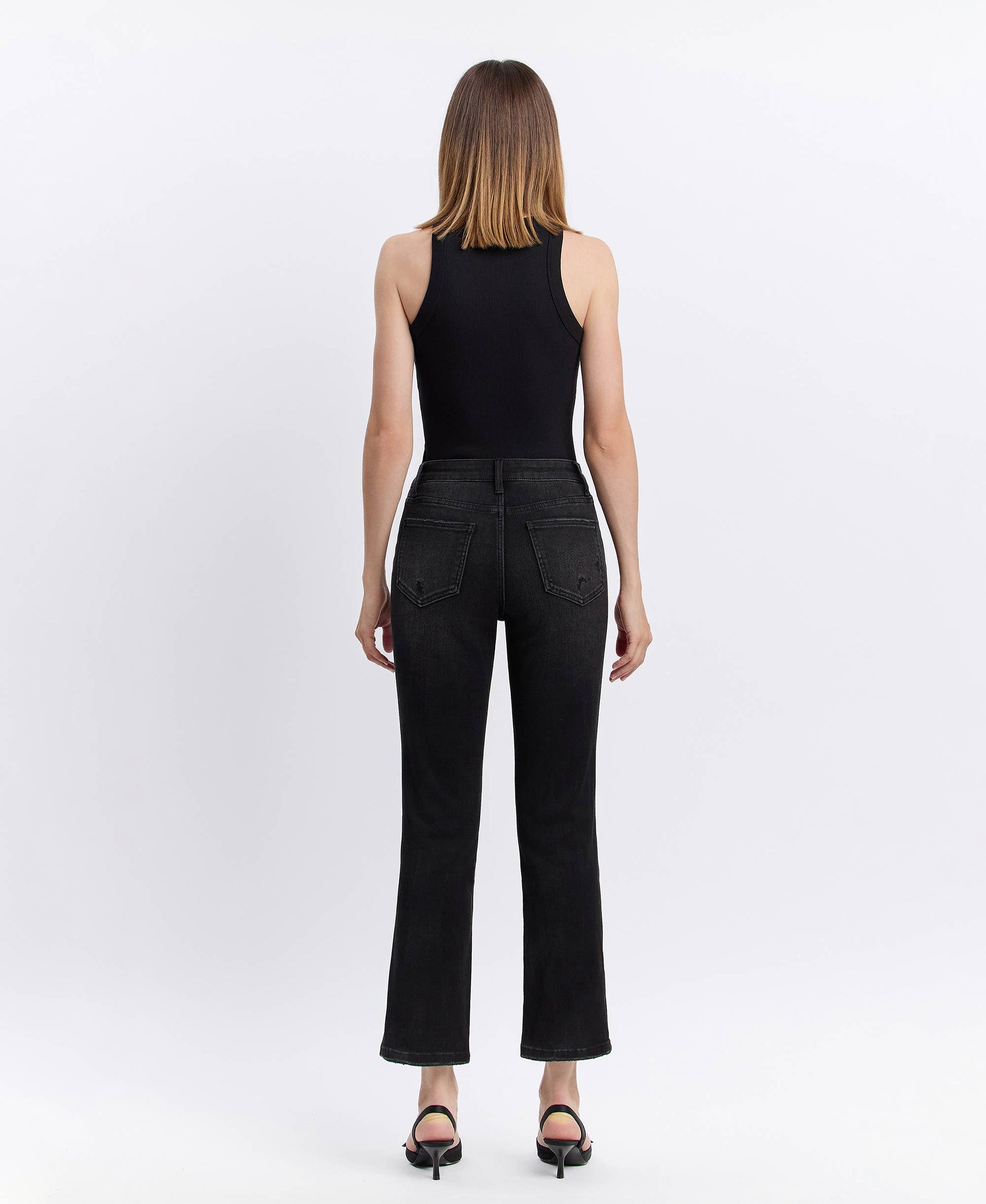 COMFORT STRETCH DENIM, HIGH RISE WAIST, DISTRESSED DETAIL, ANKLE LENGTH, STRAIGHT JEANS
