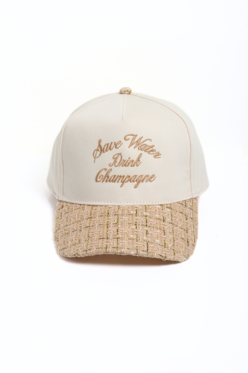 Pop some bubbly style! The SAVE WATER DRINK CHAMPAGNE Cap pairs soft fabric with a chic tweed brim — the perfect mix of fun and fashionable.