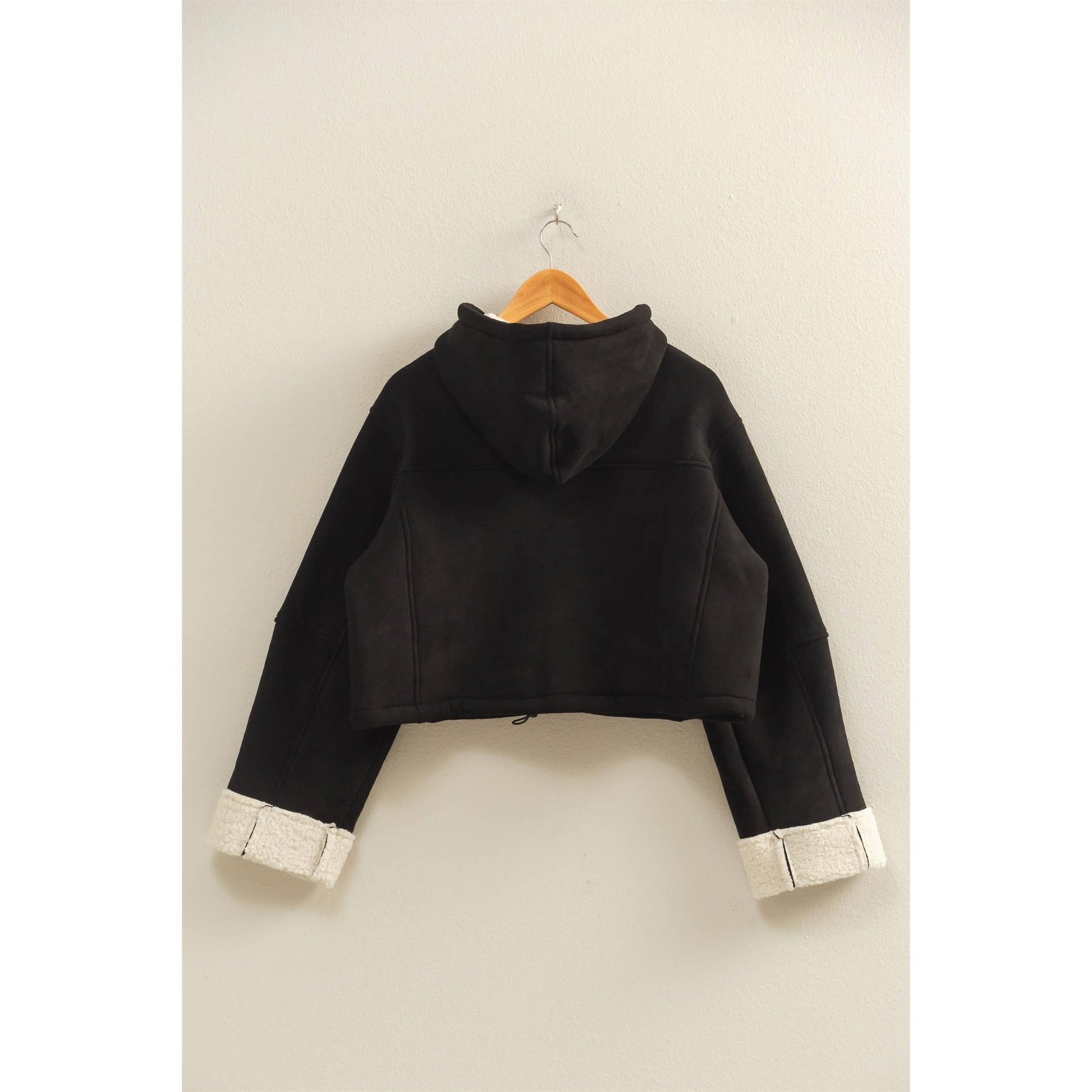 This outerwear piece features a zip-up front and hoodie, offering both versatility and comfort. Fashioned with soft Sherpa cuffs, it's perfect for crisp autumn evenings. Layer over a light turtleneck, pair with fitted jeans and boots for a refined, casual look. Ideal for transitioning seasons or a cozy night out.